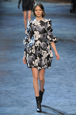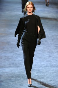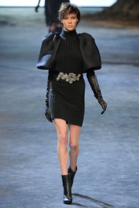 For Fall 2011, Alber Elbaz returned to the roots of Lanvin with pieces that echoed all the class and sophistication that the brand is known for. Some of the designs could easily be seen on the likes of Faye Dunaway or Glenn Close, who were clients of his former teacher and mentor, Geoffrey Beene. At the start, the looks were extremely serious in nature, not portraying the usual life and animation that is so intrinsic to Elbaz: black caped coats and blouses, high-waisted trousers, t-strap pumps, the occasional black fur, turtleneck dresses with oversized puffed mousseline sleeves channeling Victorian and modernity simultaneously. Of course, this is to be expected for Fall, but luckily the pieces lightened up as the collection moved along.