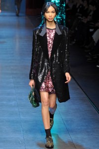 Funny to discuss Justin Bieber because there was a definite masculine influence in Dolce & Gabbana’s Fall 2011 collection. Anais Mali in a three-piece grey pinstripe suit with a contrast lapel and pink loafers was juxtaposed alongside Isabeli Fontana and Mariacarla Boscono in long-sleeve star-print gowns and earrings, equipped with all the sparkle and femininity that the brand is known for, pun intended. Some of my other favorite masculine looks from the collection were Natasha Poly in a sequin dinner jacket, tie and pleated ankle-length trousers as well as Fei Fei Sun in a totally printed look with suspenders to match.
