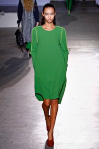 Function was the main take-away from the collection with designs that blended sophistication and athletic elements for a perfect city-girl wardrobe. There were cropped trousers galore in navy with printed piping down the side on Melodie Monrose, in khaki and black channeling jodphurs on Tao Okamoto, in blush pink and green for pops of color and in cognac leather for those daring enough to try them. Every dress looked completely comfortable for “pull over and go” appeal, some even having embellishments which made them perfect for evening.