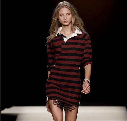 Isabel Marant showed one of my favorite ways to wear it in her Grady Striped Cotton Jersey Dress. On the runway, it was worn by Anna Selezneva in a mini dress style with a strip of mesh hanging from the front as an underlayer, giving sporty a totally new and sexy definition. It was accessorized with Gava Cotton Raffia and Leather Pumps ($820) and bedhead hair. I will always have a love for classic preppy dressing and it gets no better than a rugby-inspired dress, but I love the subtle accents that make Marant’s different including the slightly off-center button placket, the back’s pleated detail and the canvas trim at the waist. I also love that she dressed it up on the runway, which prompted my thoughts on how to recreate the look.