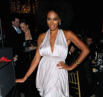 She was seen at the 5th Annual DKMS Gala at Cipriani Wall Street in New York City. Solange chose a champagne draped halter gown from Halston. For accessories, she wore jewelry from House of Waris and strappy sandals from Jimmy Choo.
