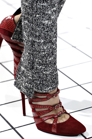 For Fall 2011, Nicolas Ghesquière gave his signature futuristic style a ladylike spin with floral prints and loosely draped hemlines falling below the knee for the utmost in femininity. The collection had a relaxed feel, which isn’t always the case with Balenciaga, usually leaning on the side of eccentricity instead of functionality. His use of leather panels was extremely interesting: on the hems of skirts, on the sleeves and collars of blouses and intricately looped and weaved onto the front of jackets.