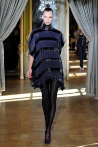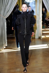Emanuel Ungaro’s Spring 2011 collection was all about femininity and a coquettish attitude. Gisele’s look was one of the darkest of the collection and gave a sense of the femme fatale. For Fall, Giles Deacon capitalized on that sultry feeling with an all-around more commanding and edgy collection. The only sugary moments came in the form of hot pink t-strap sandals on Maryna Linchuk, green tweed pieces on Tati Cotliar and Xiao Wen Ju channeling ladies who lunch and fox fur chubby jackets on Alana Zimmer and Siri Tollerød.