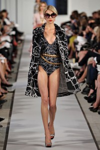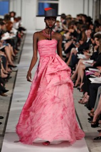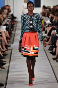 Where Oscar always excels is in red-carpet gowns. This collection was no exception with the flamenco style red ruffled number (shown above) on Ataui Deng, a super sexy emerald green draped gown with a thigh-high slit on Candice Swanepoel, a strapless bubblegum pink princess gown on Ajak Deng and a printed cocktail dress with a grey feather skirt on Tati Cotliar. All of the pieces are absolute necessities to grace Hollywood’s A-list actresses this year and I can them seen on the likes of Eva Mendes, Sarah Jessica Parker and Jennifer Lawrence.