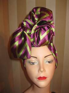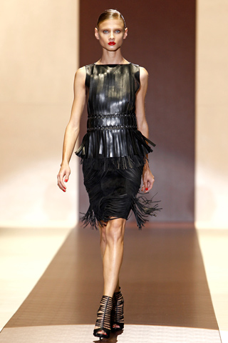 (shown above) On Camilla Romestrand: Gucci’s Spring 2011 leeveless Leather Fringe Top, as seen on Anna Selezneva. Prada’s Spring 2011 navy blue and pink striped skirt, as seen on Hannah Noble. Purple Walter Steiger pumps. François Pinton Sunnies. Hermès Cuff. June Ambrose’s Decadent Turban ($125).