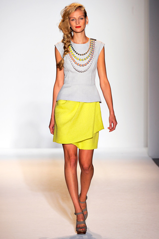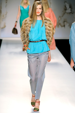 On Dani Evans: Fendi Spring 2011 Fur Vest and Cropped Sheer Gingham Pants, as seen on Mirte Maas. Lela Rose Spring 2011 sleeveless top, as seen on Zuzana. Giuseppe Zanotti Yellow Patent Leather Sandals (on sale for $440). Grey Ant Sunnies. Hermès Cuff. June Ambrose Lucy Turban ($135).