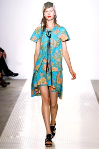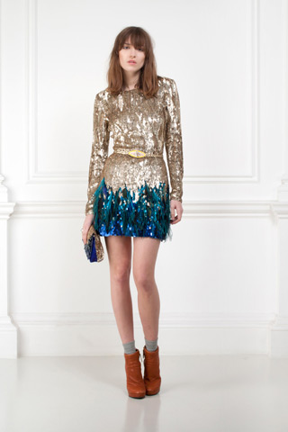 On Julissa Bermudez: Matthew Williamson’s Pre-Fall 2011 Sequin and Feather Dress. Green Suede Giuseppe Zanotti Platform Wedges. Grey Ant Status Sunnies. June Ambrose Dominique Turban ($125).