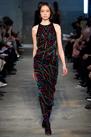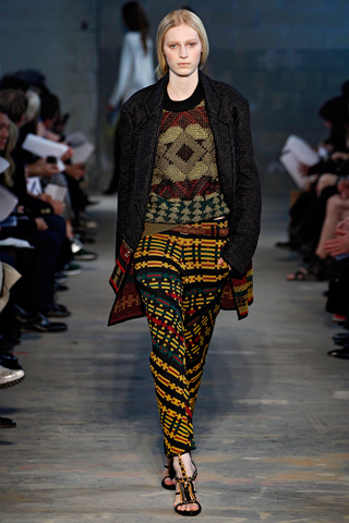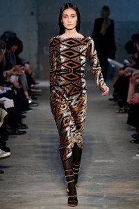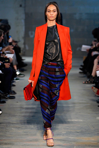 Proenza Schouler is the official brand of cool women everywhere and I must admit, the heels I own from the brand are among my top five favorite pairs. They have since also become known for their prints which take inspiration from a wealth of sources. For Fall, Jack McCollough and Lazaro Hernandez were inspired by a road trip to Santa Fe and the allure of the Native American blankets that they found there. They enlarged and pixelated those prints and the results are seen in the collection, one such print being found on Liv Tyler’s dress. They were a main focus of the collection featured on long-sleeved form-fitting sheaths on Jourdan Dunn and Jia Jing, sleeveless versions of those printed dresses, Tara Gill, Liu Wen and Joan Smalls’ slouchy ankle-length pants, a peplum striped jacket on Ruby Aldridge, as well as on chunky knit sweaters.