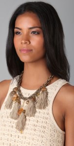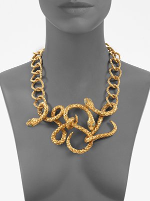 I am definitely one for more is best and tassels are such an easy way to fit that mantra. Citrine by the Stones’ Fringe Necklace ($375) makes a powerful statement and will look good with everything from a simple knit tank to your most fabulous cocktail dress. Nest makes the most beautiful stone pieces and the brand’s Chunky Stone Necklace ($350) makes a powerful statement in sultry red. One can never go wrong with anything from Yves Saint Laurent and the Jade-Accented Snake Necklace ($2450) is absolute perfection.