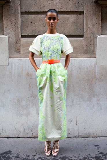 She was seen at the Musée du Louvre for the “Liasons Au Louvre II” Charity Gala Dinner. She chose a white short-sleeved gown accented with neon green and white Chantilly lace from Alessandra Rich’s Spring 2011 collection. The gown was cinched at the waist with an eye-popping coral belt and she wore nude pumps, allowing the dress to shine. The look is flawless and I am so happy to see another fashion maven wearing Alessandra Rich after Natalie Massenet wore the brand at Runway to the Green earlier this year in March.
