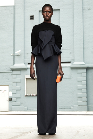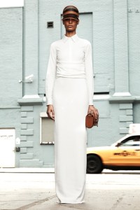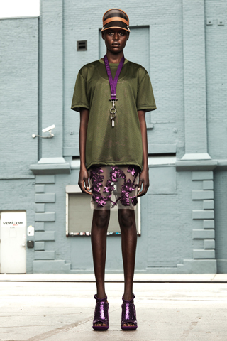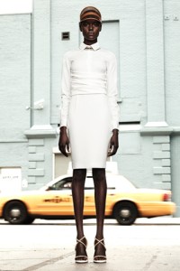 Riccardo plays with mesh which continues the sporty aesthetic of the collection. I can definitely see those pieces being worn in warm weather destinations as well as when Summer 2012 rolls around. Don’t be fooled: there is still loads of femininity in the collection. A long white form-fitting maxi skirt, sheer sequin embroidered dresses and a long navy gown on Ajak Deng that must be worn on the red carpet are all looks that remind us that Riccardo does in fact design for every woman, giving us all something to covet.