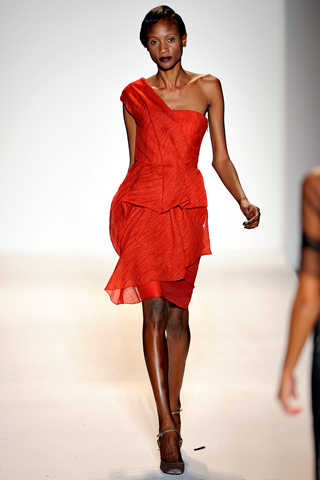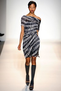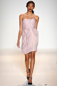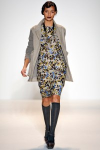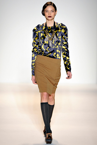 If you aren’t able to make the sale, you can still get your dose of Lela Rose by getting a look at the Fall 2011 collection. Lela was inspired by German visual artist Gerhard Richter and used his abstract designs and newspaper paintings to create the prints featured on so many of her pieces. Patterns were an integral part of the collection and my favorites were mixed: a cropped houndstooth jacket worn over an abstract dot blouse worn on R’el Dade. Femininity is inherent to the Lela Rose brand and that was visibly evident in girlish silhouettes and glamorous detailing and fabrics including feathers on Tayane Leão Melo and lamé on Gracie Carvalho.
