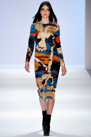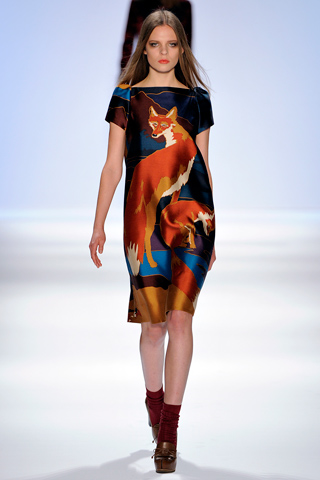 For the Fall 2011 campaign, Jill Stuart tapped Jac Jagaciak and Mario Sorrenti. The inspiration for the collection came from German artist Heidi Specker’s photographs of Germany’s Black Forest, which is a breathtaking destination and not at all dark or gloomy like the name entails. She took that natural, woodsy environment and produced pieces in rich hues, perfect for autumn. Jill took the theme one step further with fox and owl motifs, as seen on the pieces in the ad campaign. Colorblocking is in full swing again for the season and she even uses mixed media, blending shimmering metallics against matte shades and combining textures for dresses that look more like collages than ready to wear.