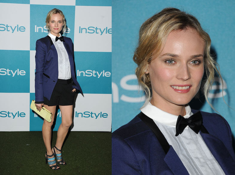Diane Kruger continually succeeds at the stylish juxtaposition and she did just that at InStyle’s 10th Annual Summer Soiree in West Hollywood. She opted for a complete look from Jason Wu’s Resort 2012 collection: a navy blazer worn over a white pleated bib blouse and black shorts. She accessorized with a black bow tie, a python clutch ($1595) and turquoise and black strappy “Arizona” sandals, all from Jason Wu. I plan on trying this look out next week, as I am always looking for ways to wear my Lanvin for H&M bow tie.