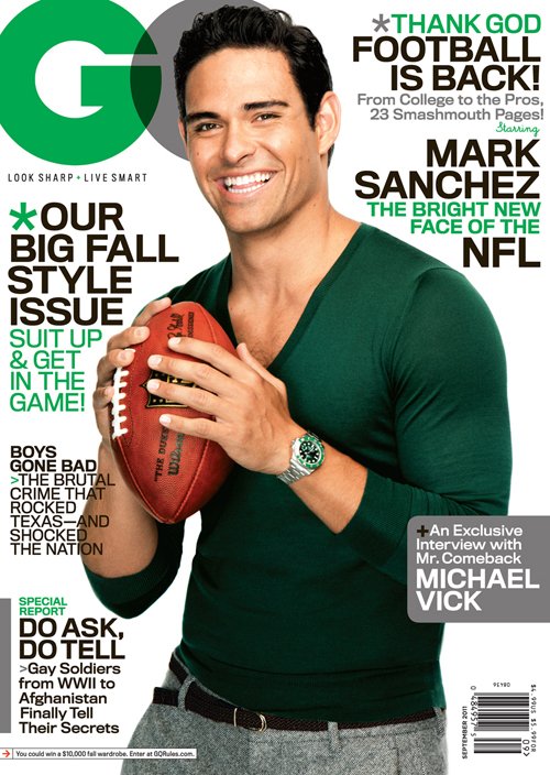 Mark is on the cover of GQ’s September 2011 issue in Jets green from his v-neck Boss Black sweater to his Rolex watch. In the fashion department, the look is a total win and will hopefully show men that going for color and the right fit is the way to look polished, yet stay on trend for Fall. I also love the addition of the skinny Tom Ford belt which is something I believe most men are afraid to try. Here it works well. Nothing about the ensemble is flashy, just clean and simple.