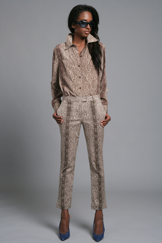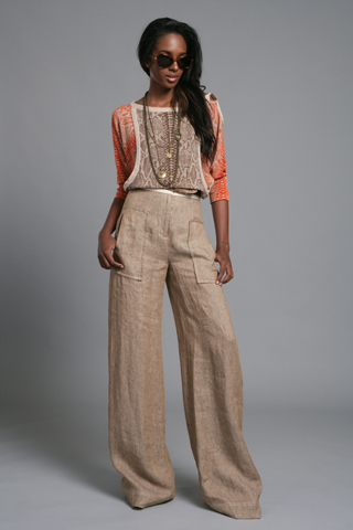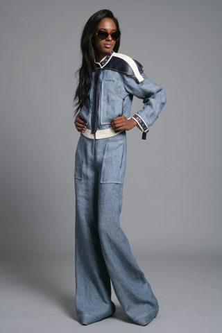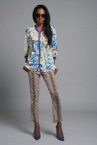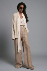 “A feminine yet relaxed mood is achieved through the juxtaposition of romance and sport, comfort and flattery. Subtle hues of khaki and blush mixed with pastel shades of waterfall, misty blue and aqua tears gradually intensify to deep saturated tones and neon brights, making a bold splash for the transition into summer. A drapey culotte jumpsuit in waterfall, complimented with drawstring waist and seductive neckline details, pairs with a lemon zest hat and printed platform sandals to embody the relaxed mood of the season.”