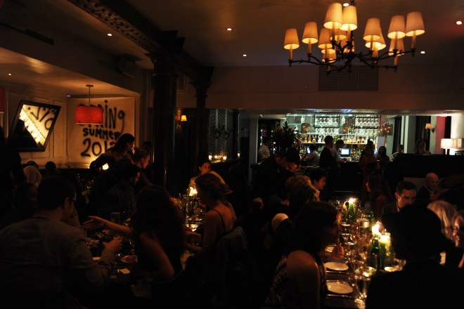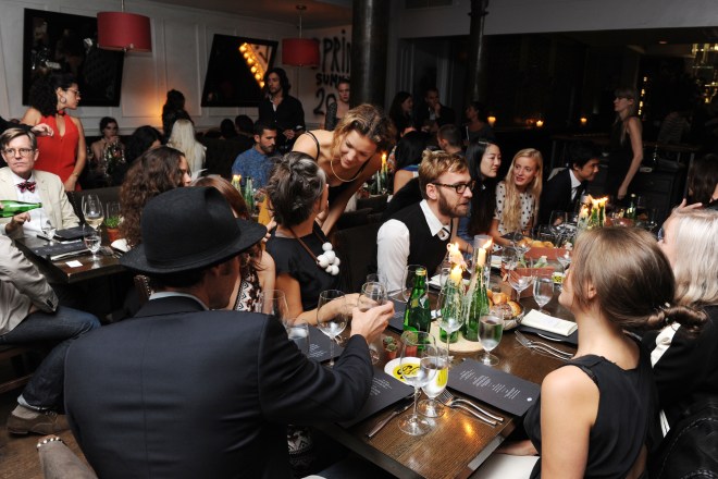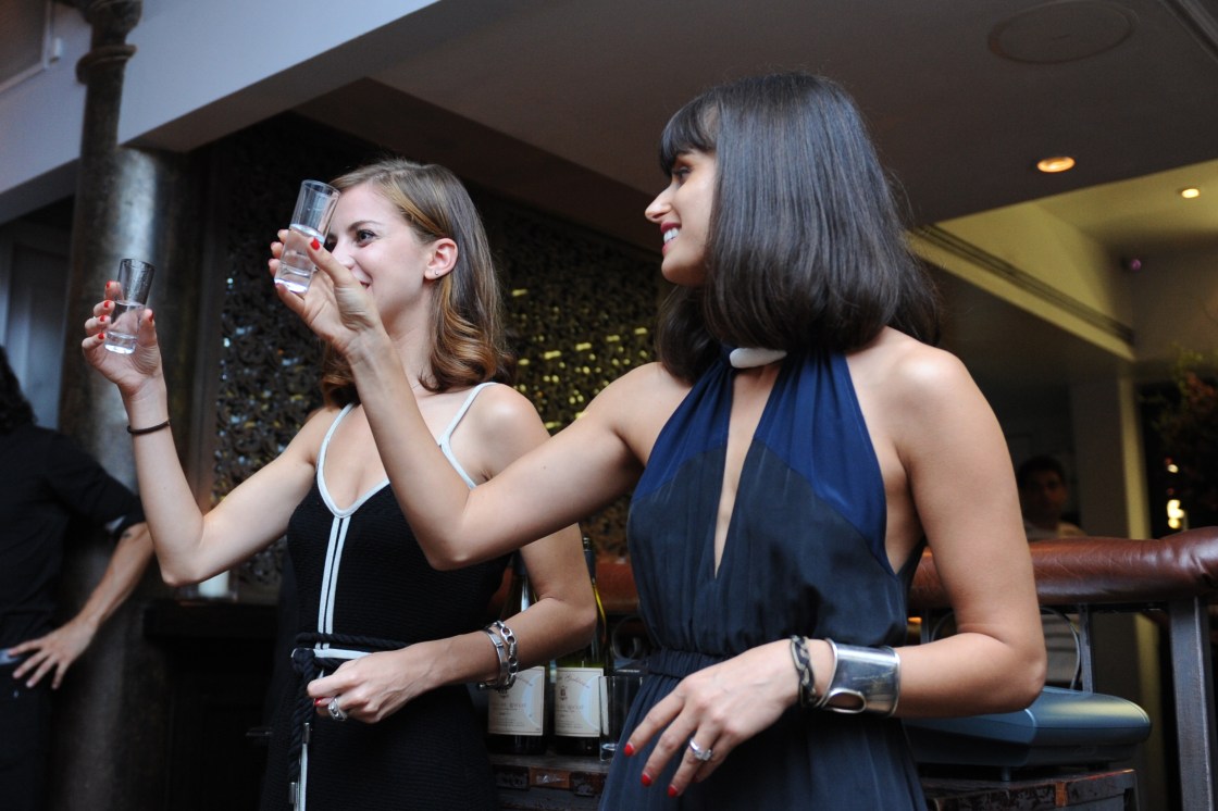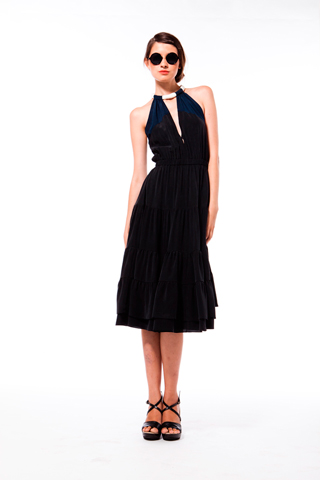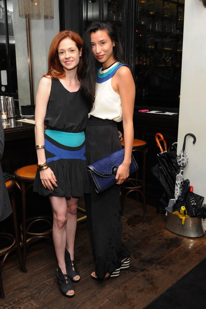 Spring 2012 Fashion Week is underway and Sophie Buhai and Lisa Mayock of Vena Cava started it off right with a dinner party showcasing their Spring 2012 collection. The design duo chose twelve of their friends to model their pieces instead of having their traditional runway show. They even wore pieces from the collection themselves: Lisa in a black and navy knee-length halter dress and Sophie in a long black dress with white piping and a thigh-high slit up the middle.