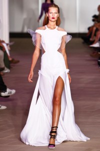 With Araki’s influence clearly shining through, Prabal touched on the idea of bondage on dresses featuring caged corset belts and thick criss-cross strips of fabric on Ming Xi and Nyasha Matonhodze. Sensual cutouts, sheer sleeves and hems and thigh-high slits were featured on most dresses including an elegant black number on Anna Selezneva, a white gown (my new dream wedding dress) on Toni Garrn and a stunner on Karlie Kloss that will certainly be worn on the red carpet in the coming months.