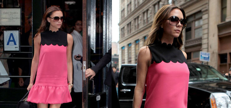 For Spring 2012 New York Fashion Week, Victoria was spotted out and about in New York City rocking a pink and black dress with scallop detailing and a drop-waist bubble hem from her new dress collection. She accessorized with Christian Louboutin’s Daf Booties. I am not usually a fan of pairing a feminine dress with booties when the weather is still warm, but it looks great here on Victoria and I am quite sure that the Daf Booties will be just as popular as their pump predecessor.