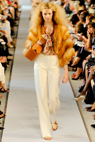 Oscar’s regular “ladies who lunch” set had nothing to worry about as his classic silhouettes were still shown including knee-length embroidered shift dresses on Lais Ribeiro and Liu Wen, a tweed ensemble on Nyasha Matonhodze resembling the sweetest of confections, Magdalena Frackowiak’s cropped cardigan and high-waisted trousers and a luxurious cropped fur on Hailey Clauson (to be worn before the weather warms up).