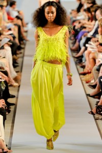 The collection started off with larger than life silk taffeta gowns in eye-popping colors including cherry red and mustard, on Liu Wen and Emily Baker. Youth shined through in the cropped lace blouses that were layered over the gowns: totally on-trend with fashion right now and quite frankly, a little ode to the 80’s. The brights continued with lime green cropped trousers on Jourdan Dunn, Nyasha Matonhodze’s feather tank and sheer pleated harem pants in the same shade, an adorable yellow sundress on Josephine Skriver, Frida Gustavsson’s red carpet-worthy cocktail dress in red with a cinched waist, another red carpet stunner in lime on Jac and a gown fit for a medieval princess on Elsa Hosk.