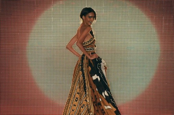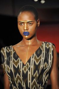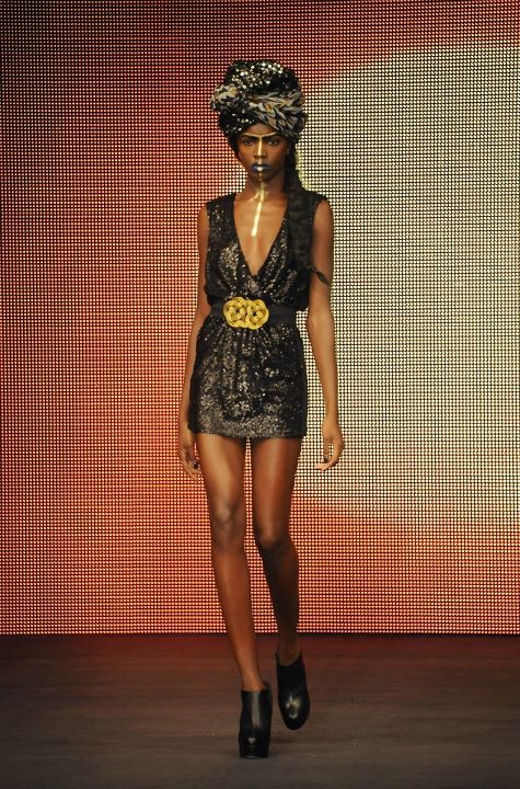 The collection blended tribal influences with a vibe of London punk. Glorious printed headwraps adorned the heads of many of the models and tribal makeup was used, as shown above on Ajak Deng in blue lipstick and gold face paint. Sequins were also a focal part of the collection as were leg-baring silhouettes, in true Beyoncé fashion.