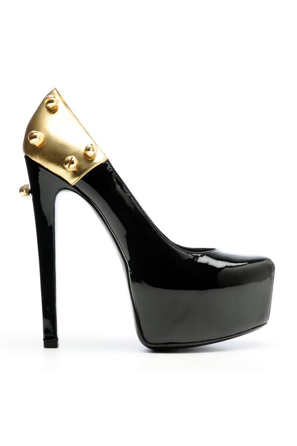 For her bow, Beyoncé walked out in an all-black look, completely adorned in sequins. She accessorized with a statement necklace and gold bangles and on her feet, killer Future Pumps from Ruthie Davis. The black and gold patent leather pumps with gold studs provided the perfect complement to her ensemble. They are not for the faint of heart, boasting a 6″ heel, but even while pregnant, Beyoncé rocks them. Wearing sky-high heels is just second nature to her.