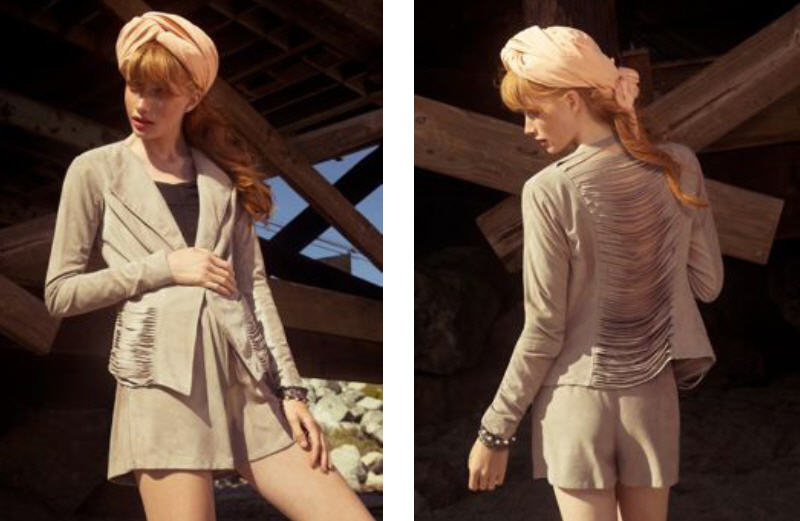 For Spring 2012, she is taking the brand in a new direction and breaking out from its signature leather jacket niche. Ready to wear is a focus, in non-leather and woven materials including linens and fine silks. In true VEDA fashion, silhouettes are simple and timeless, modern but always feminine. There is really a great deal of sophistication to these new pieces and quite a bohemian feel which I love for Spring. The designs are in contrast to Fall, with a subtle sensuality and an overall softness.