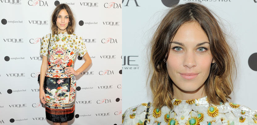 Alexa chose a Lily Pond Floral Print Dress from Mary Katrantzou’s Fall 2011 collection: slightly altered from the runway with less padding around the hips to make it more wearable. She accessorized with black t-strap pumps and a black Chanel bag. The look is definitely statement-making and powerful, though Alexa decided to dress it down instead of making it full-on glam. She is showing us that we can indeed wear florals for Fall when paired with dark, neutral accessories. I also love that the dress’ skirt is velvet: one of my favorite fabrics for Fall and making it a perfect cold-weather pairing with black tights and black suede booties to give the look even more texture.