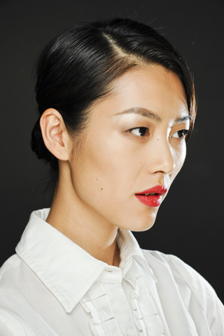Like Nina Ricci, this collection was completely feminine and elegant. Skinny belts cinched the waist wherever possible and peplum ruled, harking back to the 1930’s and 1940’s. I loved the varied color palette and prints including a three-quarter sleeve geometric print jacket on Liu Wen, a black and white windowpane skirt on Nyasha Matonhodze (shown above), Ajak Deng’s all-coral look, a beige multicolor dot print dress with a plunging neckline on Lee Hye Jung and so much more.