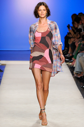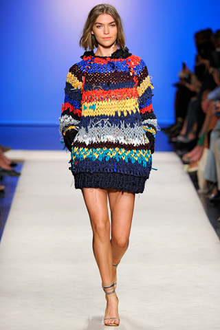 Isabel Marant’s Spring 2012 collection was right in line with her signature aesthetic: bohemian accents mixed with rocker chic silhouettes. From the first look on Arizona Muse, I knew that this collection would be bright, fun and leggy: an oversized multicolor knit hoodie dress.