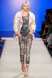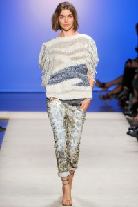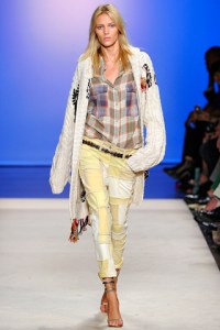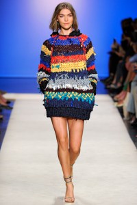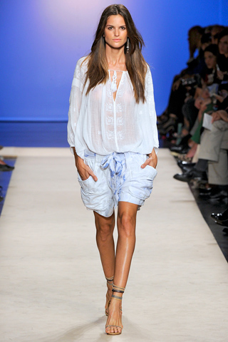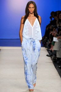 The airy baby blue jumpsuit on Joan Smalls, Isabeli Fontana’s short sleeve romper and the tie-waist shorts and sheer top on Izabel Goulart felt most like Spring and were in sharp contrast to the chunky knits in the collection.