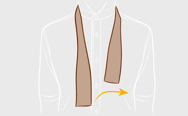 Step 1. Start with the tie draped around your neck, underneath your collar, with the side on your right two inches longer. Cross the longer side over the shorter side so they intersect directly below your collar button.
