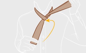 Step 4. With the loop now formed, grab the other half of the tie that’s been waiting in the wings, and lay it down over the top of the burgeoning bow.
