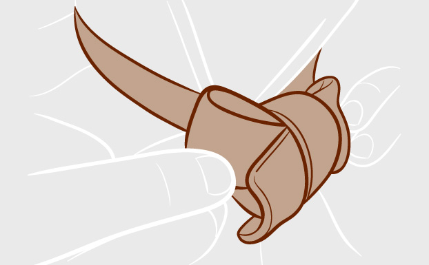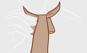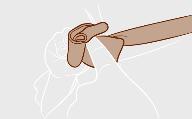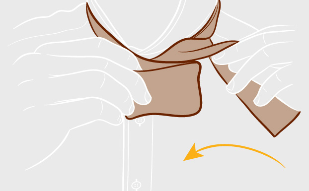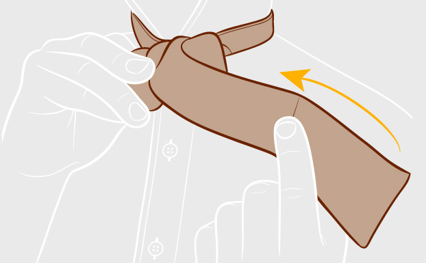 Step 3. Grasp the end of the shorter side with your right hand and push it up towards your collar so that the excess fabric loops out to the left, essentially folding over itself. That loop will become the front of your bow tie, so take care to keep it centered over your top collar button.