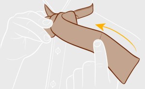 Step 8. Now use your left hand to secure the bow while you pull the new loop through to the other side with your right. QUOTE–At this point your fate, in bow tie terms at least, is pretty much sealed. If the basic shape doesn’t look right, you’ll have to start over from scratch—no amount of twisting, tightening, and cursing is going to fix matters.