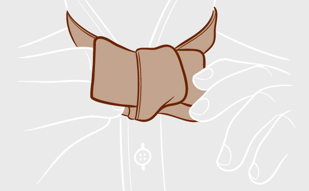 Step 6. Using your index finger to keep things centered, secure the partially formed bow with your right hand. Tug it away from your collar slightly, exposing a small hole of space behind the knot. Then pinch the free end of the tie between the thumb and forefinger of your left hand, marking a spot that’s about half of the way up from its bottom edge, and start to push it back towards the bow.