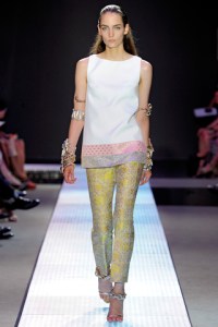 Monsieur Valli is clearly a dress man, but I really loved the pant options he showed on the runway including a zebra print cropped pair on Kate King (shown above), a pink floral brocade pair on Hanaa Ben Abdesslem and Zuzanna Bijoch’s yellow cropped brocade style that looked killer when paired with the chain link sandals. He is a designer that makes clothing that can be worn by all women regardless of their ages. For instance, the three-quarter sleeve brocade coats he showed are perfect for “ladies who lunch” but would also look amazing with skinnies and outrageous sky-high heels, great for the young fashionable set.