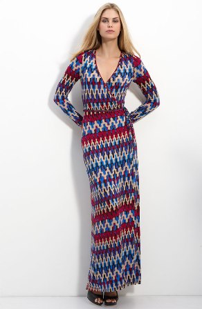 Loveappella’s Wrap Hi Lo Maxi Dress ($89) is definitely a very sexy version of the style, though it can be made more casual with a scarf and flat ankle boots. Style maven Byrdie Bell chose it as one of her Piperlime Picks. Though not long sleeved, I do love that Ravon’s Navy Jersey Convertible Maxi Dress ($88) can be worn five ways, thus really allowing you to get more bang for your buck. If you are a Missoni fan like me, Presley Skye’s Print Maxi Dress ($138) is just what you need to add a little print and color into your wardrobe.