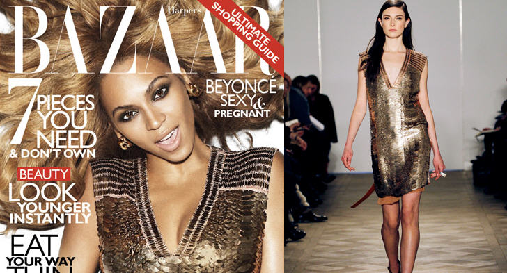 Yes, Beyoncé is pregnant and yes she will look better than most of us ever will throughout her pregnancy. Naturally, she has no intention of stopping her full-on glamour and her fashion spread is a great demonstration of that. On the cover specifically, she wears a gold sleeveless python chainmail dress from Reed Krakoff’s Fall 2011 collection. A total head-turning look and I wouldn’t expect anything less from Beyoncé.