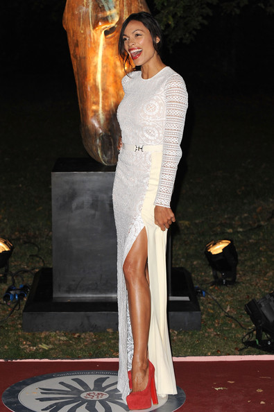 Another beauty wore this dress last month: Rosario Dawson at the Raisa Gorbachev Foundation Party in London. She accessorized with Christian Louboutin’s red Suede Daffodil Pumps ($995) and a fiery red lip, going for the more sultry color in contrast to La La’s feminine pink. Definitely one of her best looks of the year.