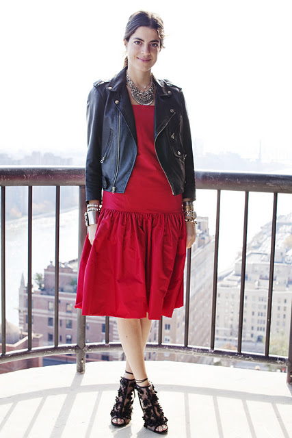 Leandra styled her look much like the model to the right with a Rebecca Minkoff leather jacket, rosette-embellished sandals from Valentino, loads of bracelets and a statement necklace from Dannijo.