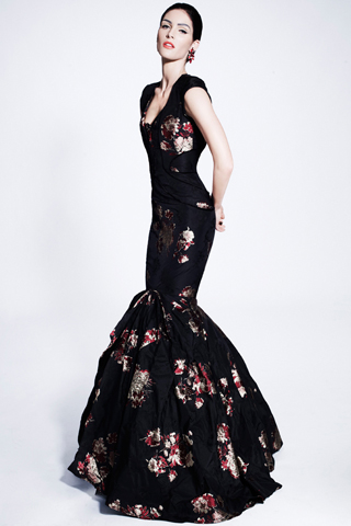 Zac Posen loves to embrace and accentuate curves, creating an hourglass silhouette whenever possible. Femininity is always on display, especially this season with form-hugging cocktail dresses and gowns in floral prints, exposing the décolletage.