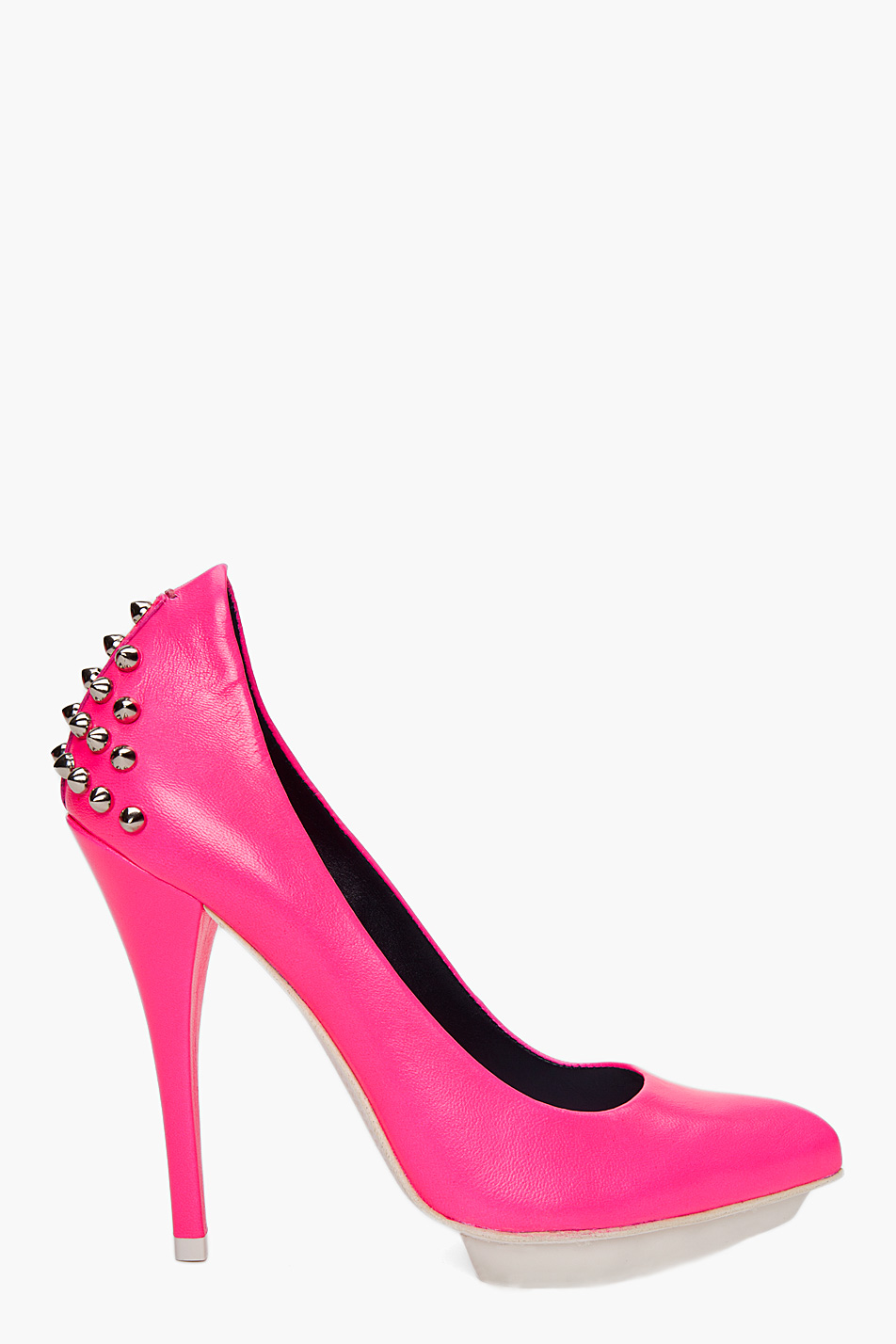 This pair of footwear is totally rocker chic in neon pink, featuring gunmetal tone stud details at the heel and 4.75″ stilettos. These are best for wearing on a night out as they might be too loud for work, unless you are lucky enough to work in a fashion office or somewhere where you can strut around in sky-high heels.