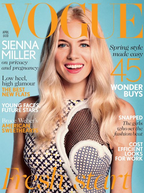 Sienna is also the cover girl for British Vogue’s April 2012 issue, rocking a dress from Stella McCartney (similar style here for $3985). Minimal makeup + slightly waved locks = she looks great!