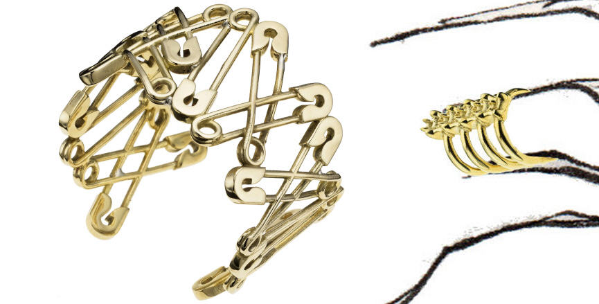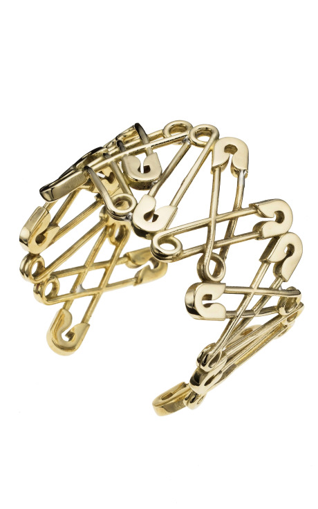My favorite piece is the Safety Pin Cuff (shown above – $650). It is crafted from solid brass and features a haphazard safety pin construction and an adjustable fit. I can see myself wearing it with a chic LBD and my favorite Proenza Schouler sandals or even on the weekends with an easy dress and over the knee boots.