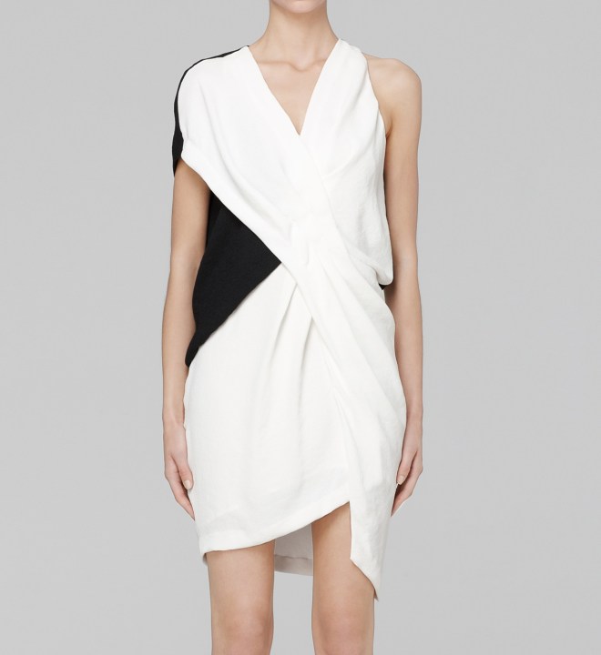 The Sugar Dress is crafted from silk and features a one-shoulder silhouette with a v-neckline, front draping and black and white contrast coloring: a great statement dress for the season that will transition right into Fall and Winter with black tights.