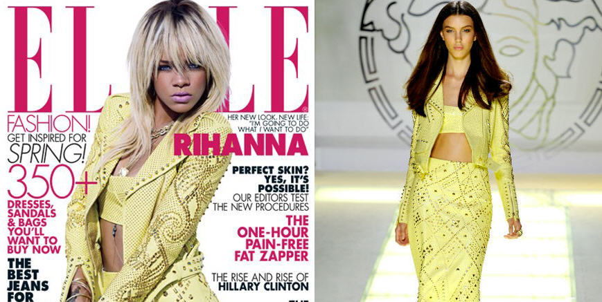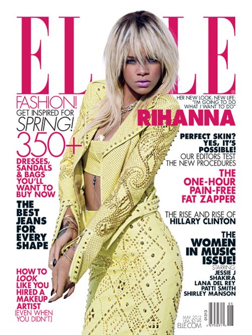 Rihanna is ELLE’s May 2012 cover girl and she looks hot! Her cover look? Versace’s Spring 2012 Studded Leather Biker Jacket.