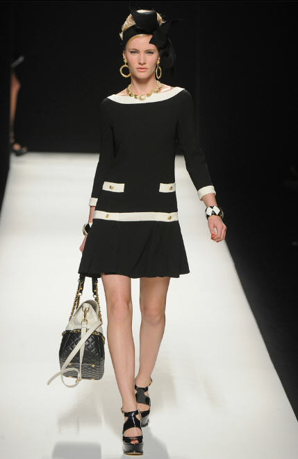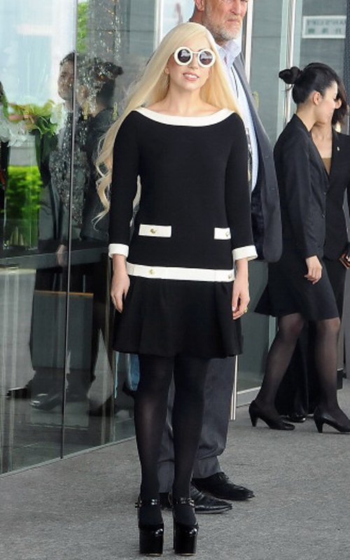 I haven’t featured Lady Gaga at all in 2012, but better late than never right? Her latest look is pretty chic! She was spotted leaving the Ritz Carlton Hotel in Hong Kong in a black and white drop-waist dress from Moschino’s Fall 2012 collection. She accessorized with black tights and sky-high mary jane pumps.
