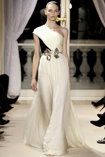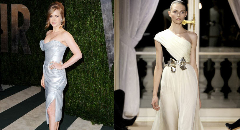 Amy Adams is set to wear a one-shoulder silk chiffon gown with a black velvet insert from Giambattista Valli Couture. With a little search through his Couture collections, I arrived at the below dress from Spring 2012, worn by Karlina Caune.